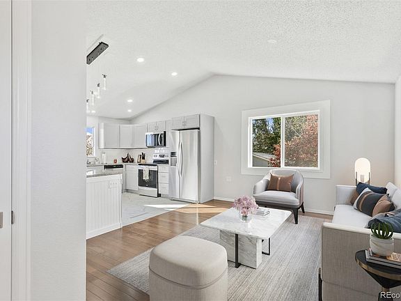 Come and discover a remarkable 4 bedroom house in Centennial that I'm confident will capture your imagination. This home is meticulously reimagined with charm and upgrades! From the moment you arrive, you'll be struck by its curb appeal as it is situated on an expansive, unique shaped parcel— larger than most in the area. A charming al fresco nook graces the front entry that is perfect for savoring afternoons with a cool beverage in hand. Step inside, & prepare to be enchanted by an interior designed for modern living and entertaining. The sun-drenched living room flows seamlessly into a gourmet kitchen that truly belongs on the pages of an design magazine. Kitchen boasts gleaming granite countertops, contemporary backsplash, and pristine Shaker cabinetry, all complemented with brand-new appliances. Adjacent to the kitchen, a dedicated dining space offers views of the backyard and a way to peek into the cozy lower-level family room. Journeying downstairs, you'll discover a supremely comfortable 16x12 lower-level family room, ideal for lively game days. A convenient half-bath is perfectly situated near the garage entry.