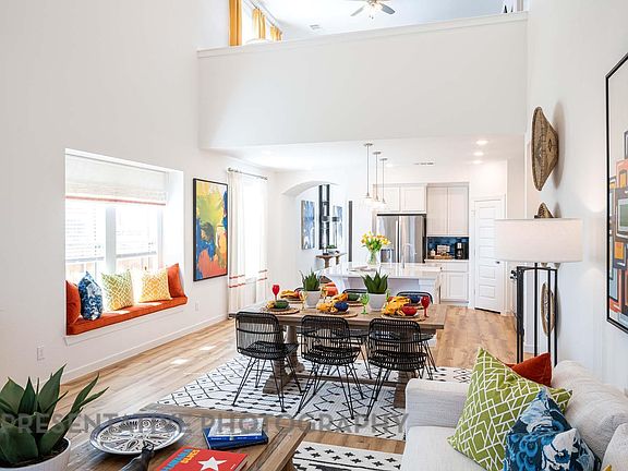 Built by Highland Homes ~ This stunning Everleigh is the same floor plan as our model home. This home features an 8' solid wood front door and covered front porch. Upon entering you immediately notice the soaring 20ft ceilings and the abundance of natural light. The kitchen is a chef's delight. This dream kitchen includes stainless steel appliances, including a gas cooktop, oversized island, generous counter space and an abundance of cabinets to the ceiling. A cozy addition to the kitchen is a window seat, perfect extra seating for family and friends when entertaining. The primary suite offers a bay window for extra seating and a spa-like bath with glass shower enclosure and freestanding tub. Secondary bedroom located downstairs with en-suite bath plus a powder bath. On the second floor is a spacious game room along with two ample sized bedrooms and shared bath. Energy Star certified Smart Home.