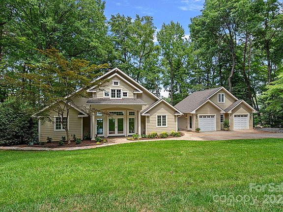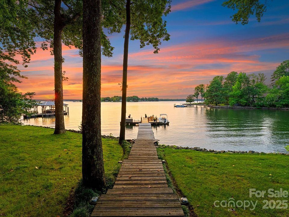 Prepare to be captivated by the breathtaking panoramic waterviews. This charming home offers the best of both worlds with a swim-friendly cove and magnificent long-range sunset views. Located on the coveted Brawley School Peninsula, this property has no HOA. Rebuilt from the studs in 2003 and refreshed with new interior paint in Decmeber 24', the home features an open floorplan with a grand two-story great room. Enjoy the architectural beauty of cathedral ceilings and floor-to-ceiling windows that showcase expansive waterviews. Every room in this home boasts a stunning lake view. The lower level walk-out basement includes 2 additional bedrooms, a family room, and a full bath. The property also features a spacious 2-car detached garage with a large walk-up storage room, plus an additional 1-car detached garage/workshop. This versatile property is ideal as a family home or vacation property. Embrace the vacation lifestyle every day in this exceptional Lake Norman home!