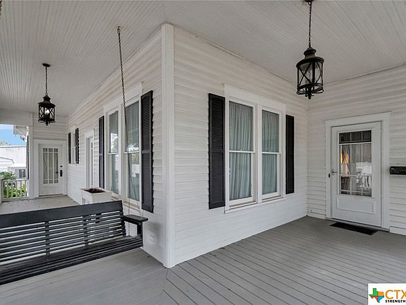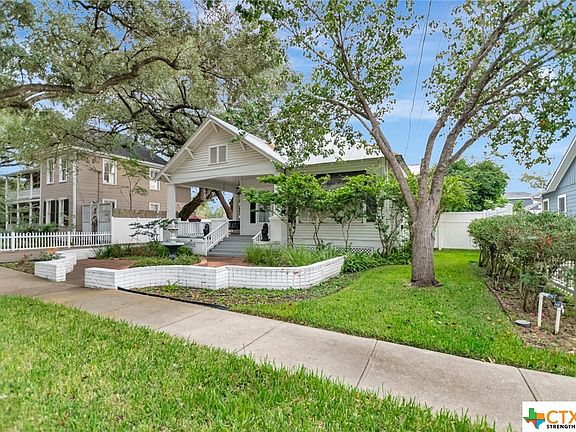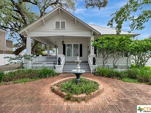Welcome to this charming historic style home nestled just a few blocks from Downtown Victoria and the up-and-coming DeLeon Plaza! This timeless home, showcasing brick architecture, invites you into a world of elegance and modern comfort. As you approach, a meticulously landscaped front yard frames the residence featuring a delightful fountain as its centerpiece. Brick columns stand sentinel, guiding you to the wrap around front porch adorned with a quaint swing. Mature shade trees provide the perfect beauty. The exterior, crowned with a durable metal roof and enhanced by contrasting black shutters, captures the essence of historic charm. Step inside to discover a thoughtfully designed 2 bedrooms, 1.5 bath haven. Wood floors lead you through the living area to the formal dining. Spacious rooms await, each exuding a sense of comfort. A sunroom beckons, providing a seamless connection to the outdoors. Venture outside to a vast covered back porch, complete with convenient pull-down shade screens. For those with a green thumb, the concrete backyard with water features offers a perfect canvas for gardening endeavors. The detached garage and storage buildings provide practicality without compromising the property's charm. Make this captivating historic gem your home sweet home!