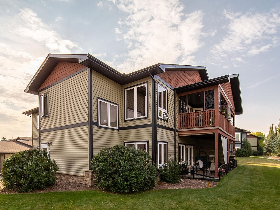 This home just feels good! Gorgeous upper level carriage home in sought after Graybriar Greens backing on to Stony Plain Golf Course. Pride of ownership is apparent in this 3 bedroom 2 bathroom unit with newer vinyl plank and engineered flooring, NO carpet. The unit is freshly painted and has some new lighting in living room, dining room and under kitchen cabinets. Gorgeous west facing balcony with sealed aggregate flooring and privacy accents. The large primary bedroom has full ensuite and the other two bedrooms are good sized. Lots of windows with Hunter Douglas blinds in the large open concept living room, dining and kitchen areas. This quiet complex is well run and professionally maintained. Double private, covered carports with ample storage situated right outside the front door come with the home. Nothing needs done when you move in. Just place your furniture, hang your pictures .. Welcome Home!