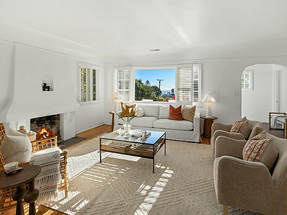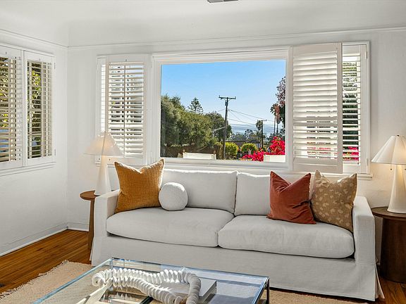 Welcome to this charming 1926 Alta Mesa home, offering a perfect blend of timeless character. This single-level gem is situated on a desirable corner lot and features stunning architectural details, including curved archways, coved high ceilings that highlight its original charm. The hardwood floors flow throughout, enhancing the home's warm, inviting atmosphere. Large picture windows fill the living areas with natural light and frame breathtaking ocean views, visible from the living room, front bedroom, and side patio area.