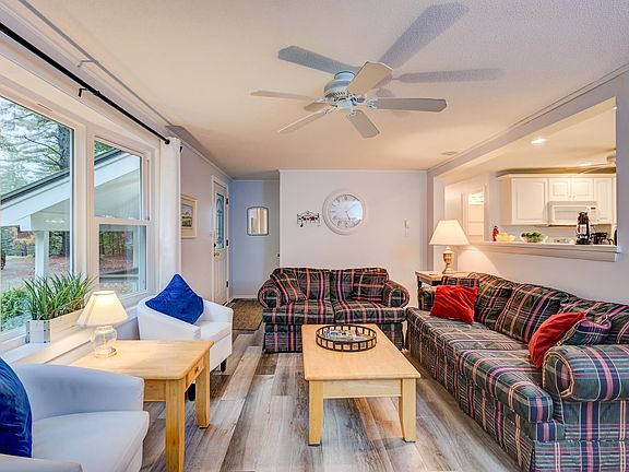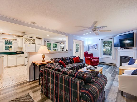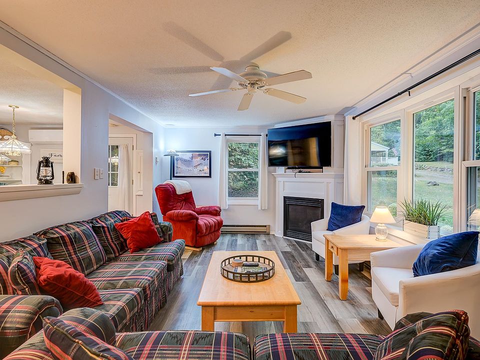 Dog friendly, this 3 bedroom, 2 bath single-level home, is ideally located less than one mile from Cranmore Mountain Resort and only two miles from the charming village of North Conway. Nestled among New Hampshire's beautiful pines, this home sits on a quiet lot with private off-street parking without pedestrians and auto traffic.. Thoughtfully designed for easy one-floor easy living, the home comes fully furnished including linens, towels, washer and dryer. It features a spacious primary suite with a king bed, a second bedroom with an additional king, and a third bedroom with one double bed and a twin, perfect for family and guests. The open layout creates a natural flow between the living, dining, and kitchen areas, enhanced by abundant natural light and a warm, cozy propane fireplace serves as the centerpiece of the living room, with a 60 inch tv above to enjoy from the open space. A mini-split provides additional heating. The well-appointed kitchen is designed for both casual meals and entertaining, with modern amenities and plenty of counter space. Smart TVs in each bedroom for convenience and entertainment. Enjoy outdoor living with an easy-access ramp and covered porch. The detached garage is ideal for parking, as well as storage. With skiing, hiking, shopping, and dining all within easy reach, call today to view this exceptional seasonal rental. Pets allowed. Available November 1, 2025 May 5, 2026.