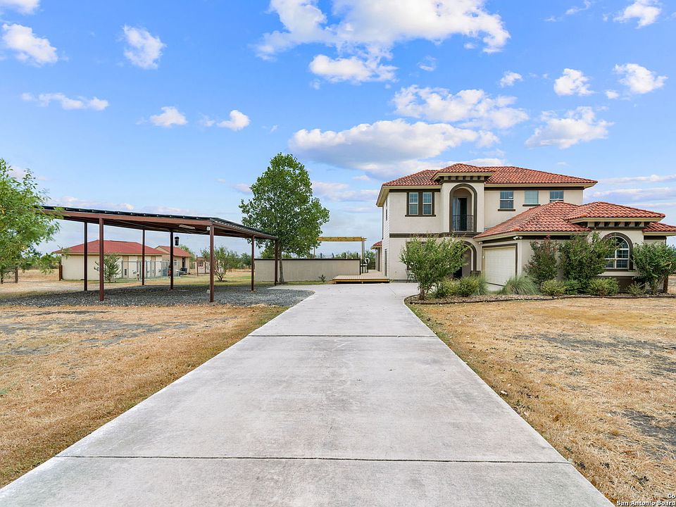 Don't miss this beautiful homestead situated on 5-acres in the charming Texas city of La Coste,Texas. This amazing residence marries tranquility with modern comfort.Located along the Texas country side this property captures the beauty of country living while maintaining convenient access to nearby conveniences of the city, including Castroville and the vibrant city of San Antonio.The exterior facade showcases the timeless beauty of Spanish architecture, with stucco walls and a red-tiled roof that complements the warm, earthy tones of the landscape. A private gate leads the way to the driveway, carport, 2 car garage, and entrance to this beautiful home.Step inside, and you're greeted by an open-concept layout that combines the living, dining, and kitchen areas. This design ensures seamless flow, ideal for both intimate gatherings and larger-scale entertaining. The interior spaces are bathed in natural light that filters through numerous windows and showcases the tall ceilings and decorative beam.The heart of the home; the kitchen, has stainless steal appliances, solid surface countertops, ample amount of cabinetry, and multiple prep areas with 2 sinks. It is a delight for both novice cooks and seasoned chefs.Three of the four bedrooms are downstairs and provide luxurious comfort and privacy. Upstairs you will find an expansive bonus room that offers versatile space for a home office, media room, game room, or even a cozy library. The possibilities are as limitless as your imagination. The 4th bedroom and full bathroom are upstairs as well. Step outside onto your expansive patio area, refreshing above ground pool, a spacious dog kennel that is thoughtfully integrated and provides a safe and comfortable environment for your four-legged friends. Nearby, a charming chicken coop adds to the property's self-sufficiency, allowing you to enjoy farm-fresh eggs right at your doorstep. With 5 acres of land at your disposal, the possibilities for outdoor activities are endless, whether it's gardening, horseback riding or simply taking in the pure beauty of nature. Located in the quaint city of La Coste, you'll relish the tranquility of rural living while being conveniently close to the enchanting streets of Castroville and the dynamic cultural scene of San Antonio. This breathtaking home on 5 acres is more than a dwelling; it's a testament to a harmonious blend of comfort, spaciousness, and the timeless allure of South Texas living.
