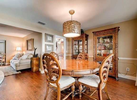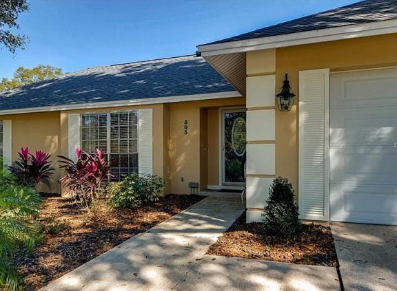 Beautifully updated and maintained split plan home in Bay Pointe. Features include a large screen-enclosed pool/spa area which is perfect for entertaining. The gas spa heater is brand new. The relaxing 38'x10' porch overlooking the pool/spa has wood ceiling w/wood beams. The re-modeled kitchen offers granite counters, nice size island with breakfast bar, stainless steel appliances, new LED task lighting and attractive wood cabinets finished off with crown moulding. The kitchen is open to the family room area. Newer Andersen insulated doors open onto the pool area from the family room, kitchen and dining room. The bathrooms have been updated. New ceiling fans have been installed on the pool porch as well as all bedrooms. Other recent improvements include very nice wood-look laminate and tile flooring; vinyl privacy fencing; nice hardie-board sided shed in the backyard for yard and pool equipment; re-finished ceilings (the popcorn texture has been scraped!); irrigation system on reclaimed water.
