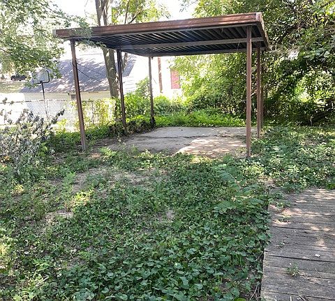 Fenced backyard with covered patio