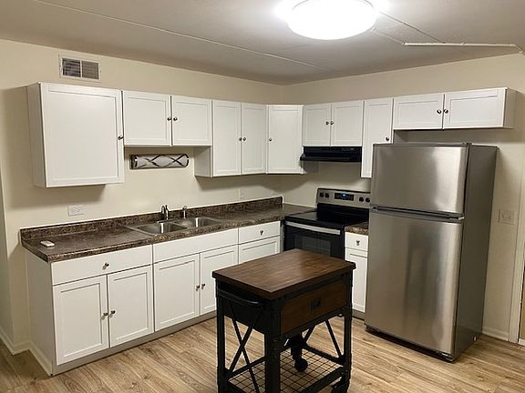 white kitchen cabinets with counter tops, stainless steel appliances; frig and stove, wood flooring through-out, trendy lighting, 2" white slat blinds, and fresh paint. Off street parking.