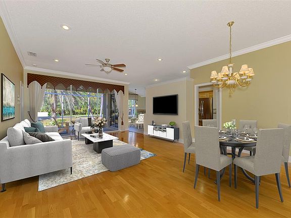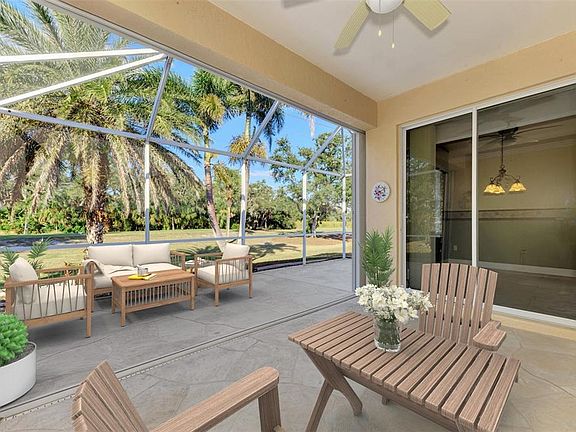 One or more photo(s) has been virtually staged. Charming Home with Golf Course Views in a Quaint Neighborhood! Located just outside the Plantation Golf & Country Club, this delightful home offers breathtaking views of the #3 tee box on Panther Golf Course from the expansive lanai, primary bedroom, and living room/kitchen sliding glass doors. The split floor plan provides two bedrooms with a guest bath on one side, while the primary suite is perfectly positioned for privacy and relaxation, featuring a luxurious en suite with granite countertops, dual sinks, a walk-in shower, and a private water closet. The eat-in kitchen includes granite countertops, pantry, and crown molding flows throughout the home. The laundry room includes convenient cabinets and Bedroom 2 includes a charming window seat. The oversized garage has an exterior door, and the outside is finished with custom curbing. The extended lanai is ideal for entertaining or relaxing while taking in the scenic golf course and adjacent water views. Membership to the Plantation Golf & Country Club is Optional. The club offers two 18-hole championship golf courses, pickleball, bocce ball, tennis, fitness center, pool and fine dining. Don’t miss this opportunity—buyers, schedule your private tour today, and agents, bring your clients to experience why this one won’t last long!