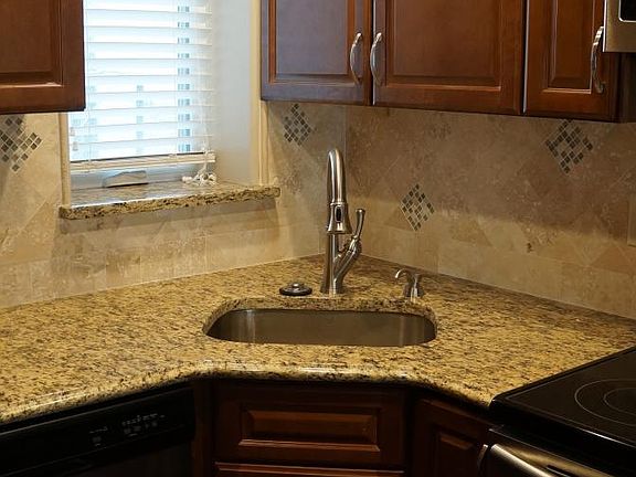 Sleek granite countertopsModern heat pumpFirst-floor apartmentCustom cabinetryStylish marble backsplashRich hardwood floorsBrick accent wall