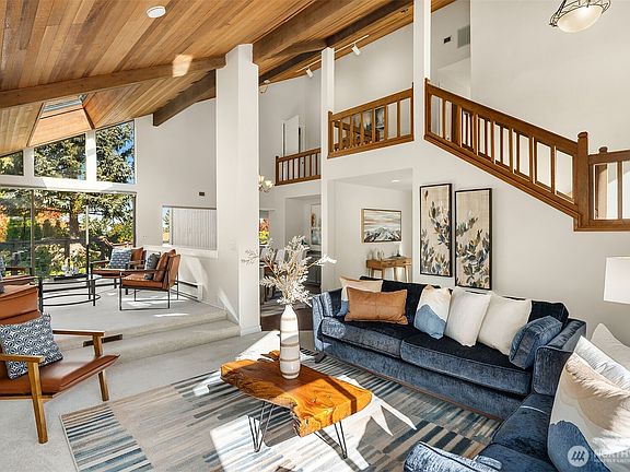 Sundrenched Northwest contemporary with city, lake & mountain views from many rooms, dramatic wood ceilings & a generous floor plan to check all your boxes. Designed to entertain, the living room opens to the dining room & includes a separate sitting area with a slider to the expansive view deck. The kitchen blends with the family room & extends to the deck. Vaulted primary suite with stunning views & a 5-piece bath. 2 additional BRs & a full bath complete the upstairs. Main floor den/5th BR with a ¾ bath close by. The daylight basement offers flexible living space featuring new flooring, a generous rec room with wet bar, spacious BR, full bath, large storage/wine room, & access to the patio & covered deck with outdoor heaters. New carpet.