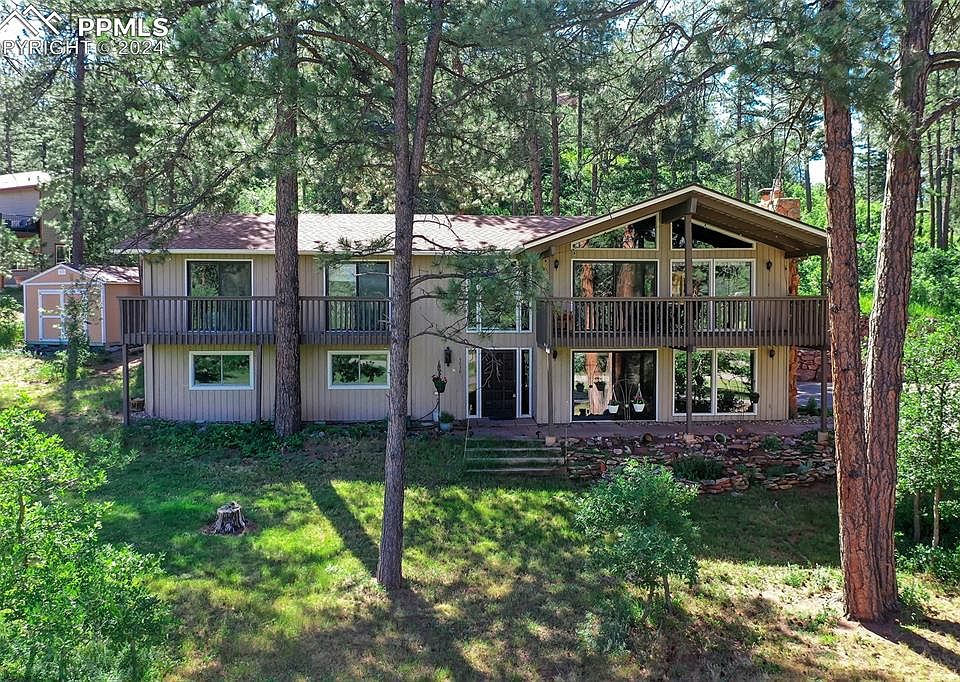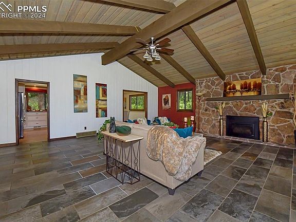 BREATHTAKING 360° VIEWS of mountains, meadow and red rock outcroppings from this unique cedar and stone Raised Ranch in highly desirable Perry Park! Private and located on over an acre, this is a gorgeous treed lot with abundant wildlife and perennials as well! There is an open 2 story entry with grand transom window above the front door and tile flooring with a walkout Family room with wood beams that creates a jaw dropping experience of panoramic views from the front, while keeping warm around a natural moss stone woodburning fireplace with heavy wood mantle. Make your way up the wrought iron & wood stairway to the walkout Vaulted Wood Beamed Great Room where you can enjoy morning coffee or evening cocktails cozied up by the impressive gas stone fireplace or the large covered wood deck, all while enjoying the tremendous views! Encased Pocket Doors lead to an Eat-in Kitchen with two walkout options to the backyard patio, quartz countertops, loads of extended height cabinets, ample counter space, counter bar seating, stainless steel appliances, pantry and picture window to enjoy views of nature and red rock outcroppings. Main level walkout Master Bedroom has attached ¾ bath w/programmable heated floors and double vanity, double closets with sliding barn doors, built in storage cabinets and views from every window! It even opens to a secondary deck! On the main floor, you will find an additional walkout bedroom, full bath and walkout laundry/mud room has cabinets, quartz counters, luxury vinyl plank flooring, and utility sink... and ALL HAVE VIEWS! 2 more lower level bedrooms with new lighting and VIEWS, ¾ bath and 21x9 utility room, along with under stair storage and access to 2 car garage w/work bench. Hot Tub, 13x13 Storage Shed w/ramps (could hold a golf cart) Simply Safe security system, Invisible Fence, gun safe, washer & dryer, and freezer included. Minutes from Perry Park Golf and Country Club, and hiking trails, this is a MUST SEE HOME with so much to offer!