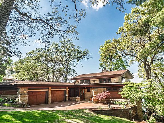 Frank lloyd wright-inspired designLevel lakeside lawnFire pitPicnic areaOpen floor planGas grillPrivate shoreline