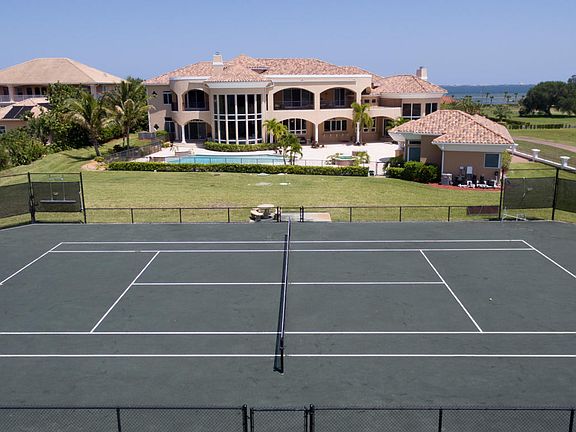 Stunning panoramic views abound from this masterful estate home high on a bluff overlooking three bodies of water, a magnificent pool area, your own personal clay tennis court and 4 gorgeous acres. Incredible quality and detail covers every inch of this spacious, luxury, custom home. Majestic Porte cochere entry highlighted by regal, double wrought iron front door. Dramatic curved lines, soaring ceilings, rich finishes and a nice easy flow throughout the interior with many gathering areas to pick from. Gourmet kitchen, private elevator, media room, game room, separate guest suite off pool, summer kitchen, generous covered outside balcony spaces, direct access to Indian River and a master suite to die for! This one of a kind property is shown by appointment only, so call today!