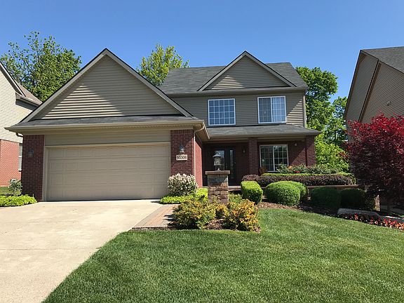 Wow, take a look at this better then new colonial in Northville Ridge! Extensive landscaping and brick patio walkway welcomes you to the covered front porch and stained glass front door w/sidelight. As you enter into the 2 story foyer note the upgraded wood floors, wrought iron spindles, and formal dining room (currently used as office). Kitchen also features staggered cabinets with crown moldings, slate backsplash, granite counters, island, premium SS appliances and under cabinet lighting. Spacious breakfast nook with new Pella french doors (w/built in blinds) that lead to gorgeous brick paver patio with built in water feature and lighting. Great room offers newer carpeting, gas fireplace and in wall surround sound connections. First floor also features powder room with granite countertop, laundry room and 2 car garage with additional storage area. Home also offers custom master closet, HVAC with 3 zones, invisible fence, security alarm, smart home features, and a 1 yr warranty.