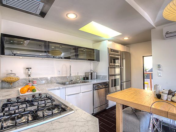 Truly a one of a kind Property that states more about the way you live, than just where you live. Exquisitely updated from top to bottom with seamless connection between indoor and outdoor living. This home is made for entertaining (i.e., showing off!) whether with friends or just home alone thinking how proud you are to live here. Open floor plan with new wood floors and kitchen with all the SS appliances a cook's kitchen needs. Two bedrooms, guest with private patio, luxury spa bathroom includes his/hers sinks, European fixtures and massage tub. Glass garage door in LR opens up to sculpted concrete front patio with built-in benches and 10' fire feature perfect for relaxing and enjoying the views. Or head down the steps past the herb gardens to a new redwood patio/deck with built-in BBQ & cook top, fridge and sink with covered canopy and water feature. Bonus room with workstations for laundry and office use. Parking for two cars. You have read it before, but this is really a must see! Offers due Friday (11/14) at 5PM.