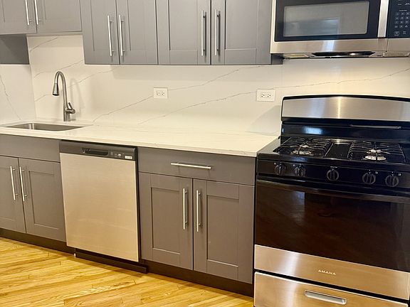 Fully Updated 2 bed/1-bath on residential street in Albany Park. Corner unit with walls of windows. Enjoy a new dine-in kitchen featuring 42" cabinets, brushed metal hardware, quartz countertops with matching quartz backsplash, and stainless steel appliances, including a dishwasher and microwave. The spacious living room is filled with natural light. The renovated bathroom has a new tub, marble tile, a stylish vanity, and modern fixtures. Both extra-large bedrooms easily fit king-size beds and include walk-in closets.