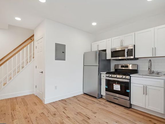 Bedrooms are on the 3rd floor. The main (2nd) floor consists of a modern kitchen, with brand new stainless steel appliances: built-in microwave, gas stove, dishwasher, refrigerator and stacked washer/dryer (all appliances brand new and in as-is condition). Along with a large bedroom, can also be used as a family room on the 2nd floor. 3rd floor you will find 2 large sized bedrooms with closets.