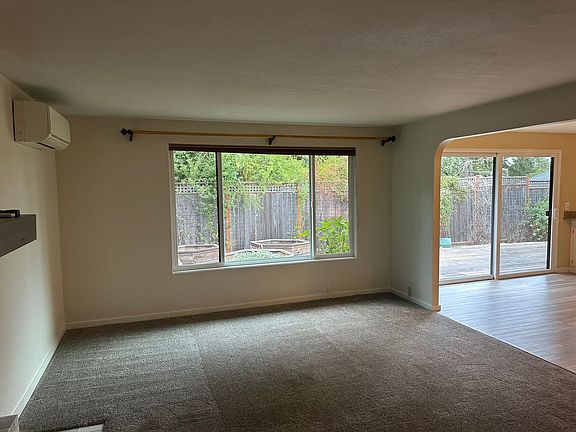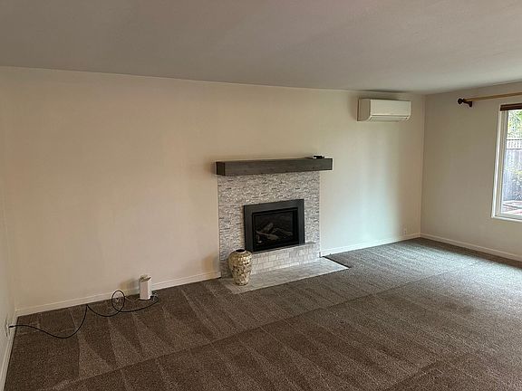 Living room has large windows for abundant natural light, newer carpet, a gas fireplace and a ductless heat pump with AC!