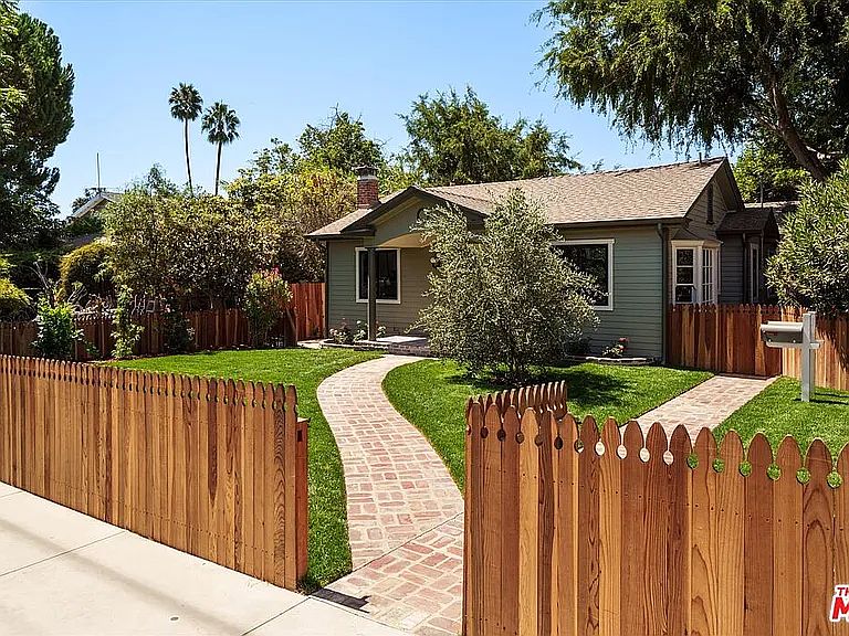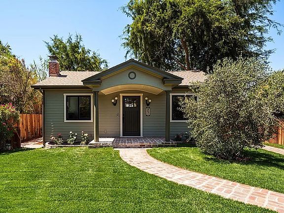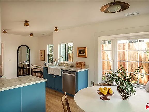 Beyond a French Gothic redwood picket fence, a pathway of hand-cut 1800's bricks takes you through the front lawn with colorful florals and a majestic olive tree. This designer bungalow has an ideal floorplan with 2 bedrooms, each with custom bathrooms. Oak floors flow throughout, including a light-filled living room adorned with a 1930s Art Deco marble pendant and vintage built-ins with preserved scrollwork. The dining room leads seamlessly into a fully renovated kitchen, complete with quartzite counters, hand-painted Portuguese tile backsplash, custom cabinetry, an integrated Fisher & Paykel refrigerator, and a Thor 6-burner range. An office nook off the kitchen offers the perfect corner for working from home.