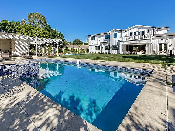 Stunning 2019 construction - 5 bedrooms, 7 bathrooms, 6,200SF of Contemporary Farmhouse Estate situated on 18,000+ SF flat lot with unique 100 foot frontage. The circular driveway in this gated estate brings you into this gorgeous open floor plan home. A chef's kitchen with a huge island, Sub-Zero and Wolf appliances opens up to the family room with a modern fireplace, surround sound and smart wiring system and pocket patio doors for a seamless indoor/outdoor experience. Complemented with stunning wood floors, a main level gameroom / office, a home theater, downstairs private bedroom/bath, wine storage area, grand dining room to seat large families, this estate is suited for everyday comfort and luxury as well as entertaining large gatherings of family and friends. Oversized master suite with an office, modern fireplace, walk-in closet and a stunning master bath. The large master balcony overlooks a lush backyard, pool and spa. 3 additional large bedrooms complete the upstairs. The magnificent backyard with an extended covered awning features a basketball half court, a pool house and bathroom, exterior kitchen, bar, firepit, permitted large custom built storage unit and endless lawn with gorgeous trees and landscaping. Excellent location within the Hesby School District, minutes from the 101/405 FWYs and just a short walk from trendy Ventura Blvd.