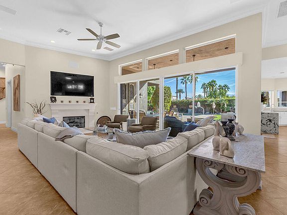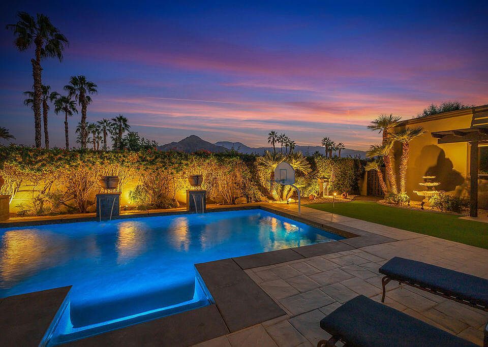 Discover the perfect balance of tranquility and sophistication in this beautifully updated and meticulously maintained 4-bedroom, 4.5 bath retreat, ideally nestled on a quiet, private corner lot in the exclusive Painted Cove community of South La Quinta. Step through impressive custom doors into a serene great room where soaring ceilings, a cozy fireplace, and unobstructed south-facing mountain views create an atmosphere of calm and natural beauty. Expansive walls of glass bathe the home in soft desert light, framing the stunning vistas and seamlessly connecting the interiors with peaceful outdoor living spaces. The luxurious primary suite is a private sanctuary featuring its own fireplace, dual spa-style bathrooms, a soaking tub, and a bonus closet/spa area--perfect for unwinding in total comfort. Two ensuite guest rooms offer privacy and relaxation for visitors, while the fourth bedroom serves as a fully equipped media room for cozy movie nights or game-day gatherings. Designed for effortless entertaining, the home showcases a sit-down bar, an elegant formal dining room with a built-in wine refrigerator, and a gourmet kitchen with a spacious center island and walk-in pantry--ideal for hosting everything from intimate dinners to lively celebrations. Step outside to your private resort oasis, where a covered patio, fire table, BBQ area, and lush, artfully lit landscaping set the stage for effortless indoor-outdoor living. The updated saltwater pool and spa, complete with tranquil water features, invite you to relax and recharge in total privacy, surrounded by peaceful mountain views. Additional highlights include a whole-home and outdoor speaker system, and a three-car garage. Built by renowned builder Peter Ministrelli, this 3,774 sq. ft. residence embodies refined desert living--quiet, private, and beautifully designed for both relaxation and celebration. Located just minutes from La Quinta's premier golf courses, fine dining, boutique shopping, and the Indian Wells Tennis Garden, it offers a lifestyle of peace, privacy, and luxury. A true sanctuary for the soul--and the perfect home for entertaining. Offered turnkey furnished.