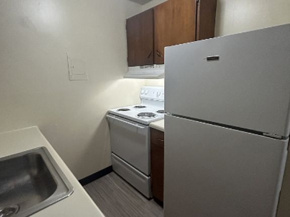 Full sized kitchenLarge bathroom vanityDouble door sliding dividerNatural lightMedicine cabinetShower tubLarge storage closets