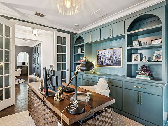 From the moment you arrive, this beautifully updated 4-bedroom colonial feels like home. The entire house, inside and out, has been freshly painted, creating a clean, modern backdrop for everyday living. Step inside to find spacious living areas, a dedicated media room, a game room complete with a full bar, and a private office enhanced with brand-new built-ins, finished in a soothing dark green, and a wood burning fireplace. The dining room stands out with its striking accent wall painted in a modern new navy-blue, a new chandelier which adds a touch of elegance for hosting gatherings. In the heart of the home, the kitchen has been thoughtfully refreshed with dark greenish black painted cabinets, new built-in shelving, a wine rack, new cabinets, new countertops, and brand-new appliances. A fireplace warms the adjoining breakfast area, creating an inviting space to start your day.