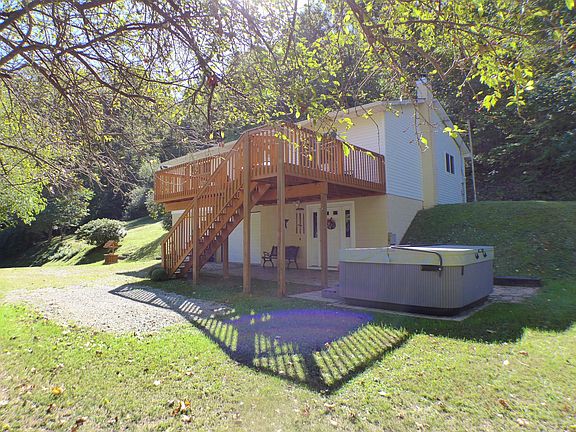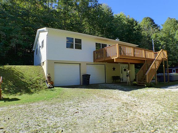 Beautiful Country home on 5.13 Acres of land. 2 Bedroom, 1 1/2 baths, Living Room, Kitchen with bar area, eat in kitchen, finished basement with lower level Laundry. Large Deck, patio underneath. 2 car attached garage, Nice shed with small side carport. Trails in woods. Cherry, Peach and apple Trees. Wood burner in finished basement. Water softener, whole home filter.