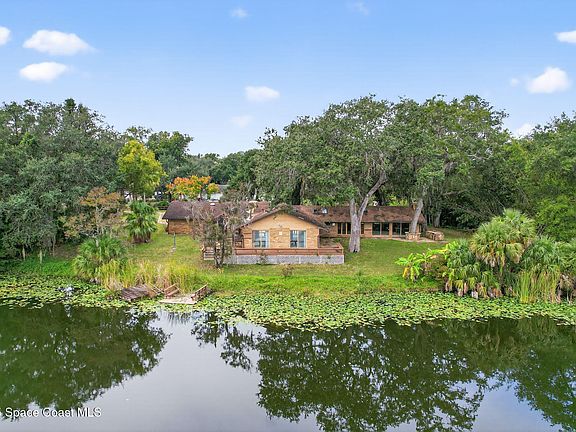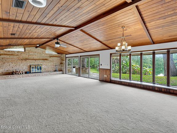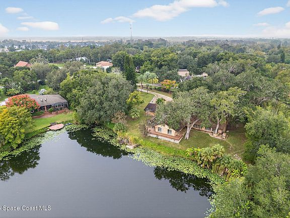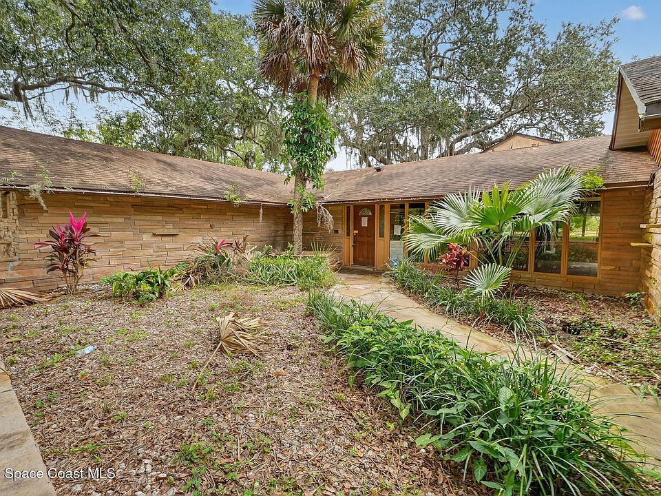 Where architecture meets nature, this rare mid-century modern retreat offers privacy, water views, and timeless design on 1.62 acres at the end of a secluded cul-de-sac. Floor-to-ceiling glass captures panoramic views of a peaceful non-motorized pond surrounded by mature trees, creating a private sanctuary perfect for paddleboarding, wildlife watching, and quiet reflection. The striking architecture features cedar tongue-and-groove ceilings, split-stone fireplaces, and a seamless indoor-outdoor flow. A dramatic family room with soaring ceilings anchors the home, while the private primary suite opens to nature with its own outdoor hot tub. Multiple decks and a screened atrium connect every space to the surrounding landscape. Located near downtown Titusville, waterfront dining, rocket launches, and nature preserves, this is more than a home—it is a lifestyle defined by serenity, design, and connection to nature.