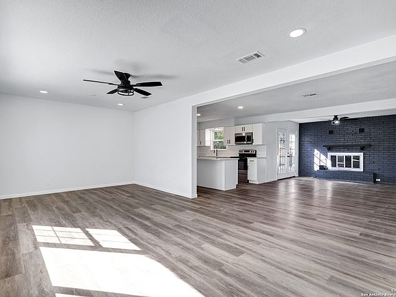 Cozy wood-burning fireplaceStainless steel appliancesQuartz countertopsNew vinyl flooringBright modern kitchenVersatile flex spaceSleek black fixtures