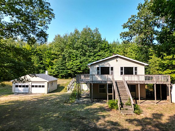 Discover the perfect investment opportunity or your dream home on this beautiful 5-acre property! This 2-bedroom, 2-bath home with a walkout basement features one bedroom, full bathroom, kitchen and a living room on each level. New roof May 2024 on home and garage. While the home needs some work, its private location boasts a picturesque setting with a very nice pond filled by Ransom Creek, offering endless possibilities for those seeking a peaceful retreat. The pond is connected to Bills Lake by the Ransom Creek so over the years it's provided a great place for swimming and excellent fishing. The 2-stall garage provides ample parking and storage space. Cash or conventional financing only. GPS is not accurate and will take you past the home so watch for my signs/directionals.