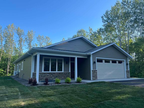 Brand New Construction! Set back on over 3+ wooded acres, this quality-built 3-bedroom, 2-bathroom home offers privacy, comfort, and convenience—just minutes from local schools and the Wellness Center. Thoughtfully designed with an open floor plan, the home features luxury vinyl plank flooring throughout the entry, living room, kitchen, and dining area. The kitchen boasts white cabinetry, granite countertops, stainless steel appliances, a center island, and modern LED lighting. The adjacent dining area opens to a peaceful, wooded backyard through a patio door, while the living room is warmed by a cozy gas fireplace. The spacious primary suite includes a walk-in closet and a beautifully tiled bathroom with a luxurious walk-in shower. A large laundry/mud room comes fully equipped with washer, dryer, and sink for added convenience. Mechanical highlights include a high-efficiency gas combi-boiler with on-demand water heater, radiant in-floor heat throughout the home and attached garage, ductless A/C, and an air exchanger. Exterior finishes showcase LP Smart Siding with stone accents, a stained entry and a paved asphalt driveway, concrete sidewalk, and a finished garage apron. A brand-new, energy-efficient home at an affordable price—don’t miss this opportunity to make it yours!