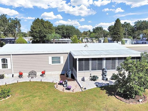 WOW, SO MANY UPDATES!!!! BEAUTIFUL 2 bedroom, 2 bathroom home in the highly desirable 55+ community of FOXWOOD LAKE ESTATES WHERE YOU OWN THE LAND!! This beautifully landscaped home welcomes you inside from the first moment you drive up! Step inside the finished Florida Room with updated windows and separate heating and AC, then enter into the spacious living room and dining room! Around the corner is the updated kitchen with new cooktop, new countertops, tile back splash and wood cabinets! The primary bedroom is extra large and the remodeled bathroom with walk-in shower is fabulous! The home also has updated windows, textured walls, metal roof over 2016, Lennox 4ton AC 2023, a gorgeous paver driveway which also encompasses some of the surrounding landscaping. There's also a screened in patio off the driveway to enjoy the fresh air in the cooler months. Whether you're looking for a full time home or a Florida get-away, come and see this gem for yourself!!! This active community is perfectly located near I-4, shopping, restaurants, 35 miles from Disney World and all of Orlando's attractions or a short drive to Tampa and the gulf coast beaches!! Take advantage of the very low HOA dues with community features that include a large clubhouse, game room, billiards room, sauna, fitness center, library, large heated pool, hot tub, pickle ball court, shuffle board courts, bocce ball court, basketball hoop, horse shoe pits, paved walking path around the lake and so much more!! Lots to do in this caring and active community like pot-luck dinners, entertainment series, dances, Wednesday morning coffee, raffles, bingo, zumba, pilates, line dancing lessons, pool aerobics, golf cart parades and many holiday celebrations! Schedule your showing today!!