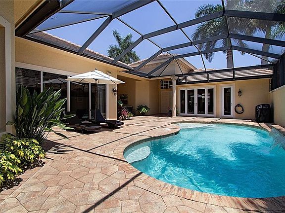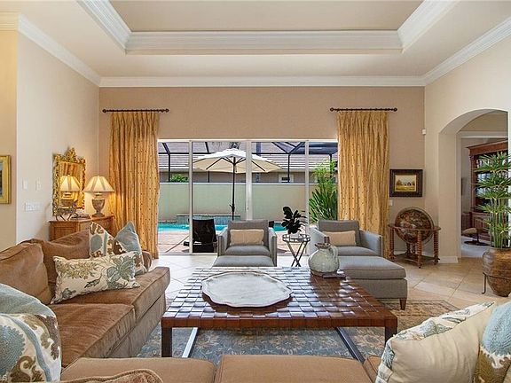 Introducing a meticulously maintained, courtyard pool home. It lives like a private resort surrounding a screened pool lanai. The main house has 3 bedrooms and den with the 4th bedroom and bath in the guest cabana. 3,135 sq. ft. under AC, with a 3-car garage! All bedrooms have en-suite bathrooms for privacy, and there is a powder room for guests. Sliding doors open the Great room to the lanai, making for an indoor/outdoor living environment. Gourmet kitchen with granite countertops and stainless steel appliances. The Master Suite has dual vanities, a jetted tub, a walk-in shower, and two walk-in closets. French doors open to the courtyard and pool. Upgraded with plantation shutters, crown molding, new carpeting in the guest bedrooms, ceiling fans, and tile floors throughout main living areas. Improvements in 2019 include a new flat tile roof, two new AC systems, a new water heater, and freshly painted! Gated community of Banyan Woods has low HOA fees, a fitness center, and a playground. Great location, close to A1 rated schools, Gulf beaches, shopping, and restaurants. Make it YOUR home soon!