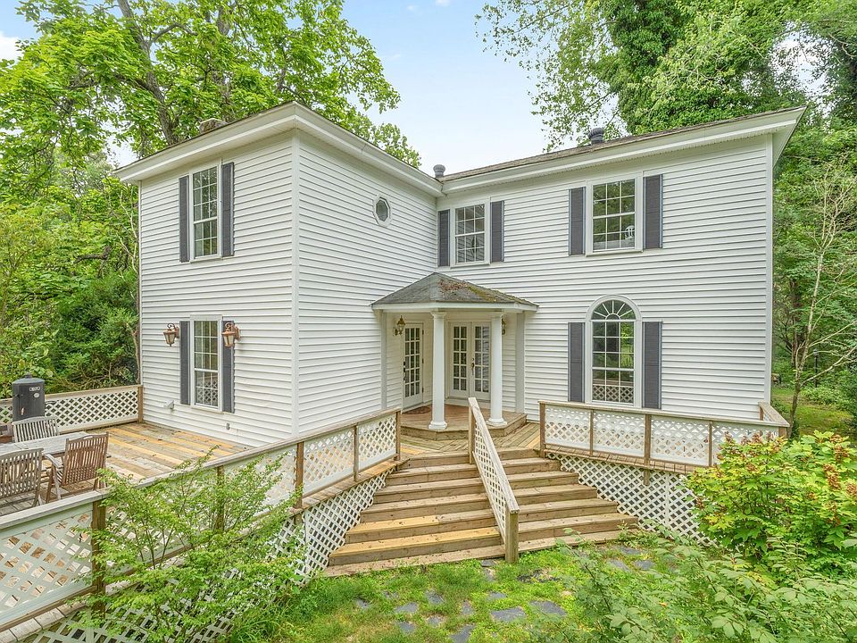 Step back in time with all the comforts of modern living in this beautifully renovated 1837 farmhouse nestled on 45 acres of serene countryside. Thoughtfully updated in 1999, the main home features 3 bedrooms, 2.5 baths, original hardwood floors, soaring ceilings, abundant natural light, large windows, a slate roof, and charming architectural details throughout. The expansive rear deck is perfect for entertaining or simply enjoying the views. A separate guest cottage, built in 1968, offers 2 bedrooms, 1 bath, a full kitchen, and cozy living space—ideal for guests, extended family, or rental income. The oversized detached garage includes a spacious loft area above for storage or potential workshop/studio space. A large cargo barn and approximately 20 acres of fenced pasture lead down to picturesque Judy Creek, complete with a camping area for outdoor fun. Beyond the creek, you'll find roughly 25 acres of mature hardwood forest perfect for hiking, hunting, or exploring. Tucked well off the road for exceptional privacy, this property is a true haven for nature lovers, hobby farmers, or those seeking a peaceful retreat.