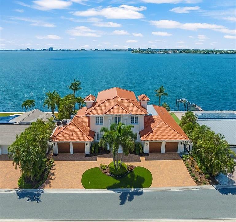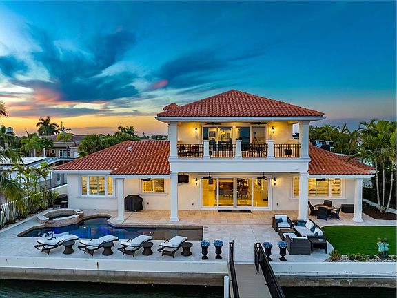 Newly remodeled and ready to enjoy, this exceptional waterfront estate in Brightwater Beach Estates offers the ultimate blend of luxury, comfort, and coastal living. Positioned on deep, open water with panoramic views of Boca Ciega Bay and the iconic Don Cesar, this home delivers a true resort-style experience in one of St. Pete Beach’s most desirable neighborhoods.  Just steps across the street from the sandy Gulf beaches, you’ll enjoy the rare convenience of both beach and boating lifestyle. Walk to shoreline sunsets, beach cafés, shopping, and entertainment — and you're only a short drive to Downtown St. Pete, known for its arts, dining, waterfront parks, and vibrant culture.  Inside, soaring ceilings and expansive windows fill the home with natural light and showcase the stunning water views. The gourmet kitchen is equipped with Sub-Zero, Wolf, and Bosch appliances, including a gas cooktop, custom cabinetry, and elegant stone finishes. The main-level primary suite provides private waterfront views along with a spa-inspired bath and custom walk-in dressing room.  The upper level is designed for entertaining — offering a spacious media/game lounge, wet bar, guest suite, and a private balcony overlooking the bay.  Step outdoors to your private waterfront oasis featuring a heated PebbleTec saltwater pool & spa, multiple outdoor seating and dining areas, lush tropical landscaping, and a new composite dock with water, electric, and a 20,000 lb boat lift providing quick access to the Gulf.  Additional highlights include hurricane impact windows & doors, smart home automation, travertine flooring, plantation shutters, custom lighting, newer roof with hurricane clips, and a 4-car garage with ceiling height ideal for vehicle lifts — perfect for car collectors.  This newly refinished estate delivers luxury, lifestyle, and location — all in one spectacular, turn-key waterfront residence. Buyer to verify all dimensions and sf are approximate   originally built in 1969 newly reovated  and meticulously rebuilt from bottom up  in 2018
