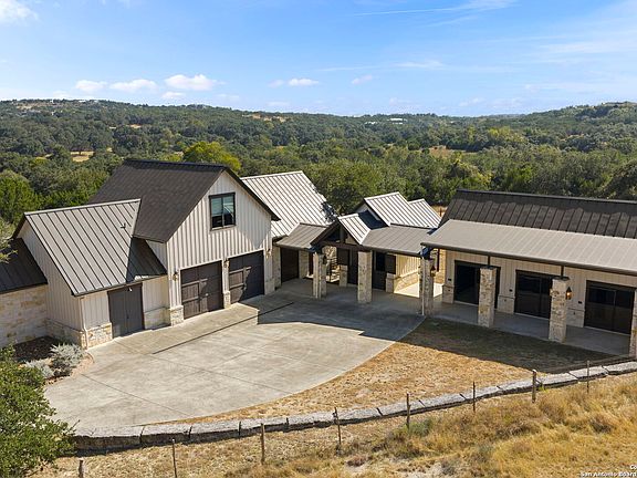 This remarkable 11.5 acre estate offers the utmost in sophisticated living with breathtaking views and a vast array of amenities. The property boasts a 5,472 sq.ft. main residence, a 900 sq.ft. outdoor kitchen pavilion, a 975 sq.ft. garage loft, a 325 sq.ft. guest apartment, three custom horse stalls, and a luxury air-conditioned and heated dog kennels. Sustainable amenities include a 3,000-gallon holding tank, rainwater catchment system, whole-house generator, and a high performing well, all within a privately gated stone-and-iron entry with meandering drives. The custom home embodies timeless appeal combining luxury, functionality and Hill Country charm! No detail was overlooked when this property was designed! Upon entry, you are immediately taken aback by the views and the beauty of the interior! From the two-story soaring ceilings to walls of seamless glass windows and transoms, arched entryways, distressed hardwood flooring, ornate chandeliers, furniture style cabinetry, Hunter Douglas shades and striking mouldings; this home has it all. The sprawling floor plan boasts a living room with a towering cathedral ceiling, a formal dining room, private study, game room and a grand flex room that can be tailored to fit your lifestyle. The culinarian is sure to appreciate the island kitchen that was perfectly designed to house all the quintessential cooking elements that one needs. The Viking 6-burner gas range with a double griddle and double ovens is complete with a striking stainless steel Vent-A-Hood. There is an abundance of custom cabinets, workspaces, beautiful backsplashes and a built-in side by side Sub-Zero refrigerator and freezer. For relaxed living, retreat to the grand family room that features a full wet bar, wine refrigerator, ice-maker and cigar humidifier. The owner's wing is a private sanctuary with a sitting room, outdoor access, and a spa-worthy bath boasting a freestanding Victoria Albert tub, elegant vanities with designer sconces, and a seamless glass walk-in shower with multiple shower heads and body jets. The custom wardrobe room features a packing island, dust-free cabinets and beautiful finishes making getting ready effortless and enjoyable. Completing the main residence are three secondary bedrooms and an attached two car garage. Once outdoors, you will be in awe of the sprawling grounds and amenities reminiscent of a luxury resort! Enjoy relaxing under the expansive covered patio, in front of the lodge style fireplace or dining under the pergola! When it's time to cool down enjoy a swim in the pool or relaxing evenings in the spa! The soothing pool waterfall and gentle brook set a serene and peaceful ambiance. Adding to the allure of the backyard is the elaborate, one-of-a-kind, outdoor kitchen! Sets of double iron and glass doors open to create an airy and breezy kitchen! Features include a lounging area with a striking stone fireplace, sprawling wraparound sitting bar and a partial bath. The grill master will appreciate this outdoor kitchen complete with a built-in Lynx grill, a Lynx prepping station with double burners and a beverage station with an ice-maker! For the craftsman and workshop enthusiasts, the detached five car garage is well insulated and heated. Enjoy hours of relaxation in the ultimate man cave! Containing a loft for lounging and watching your favorite sporting events. Four oversized garage doors at each end allow for an easy pull-through experience - perfect for RV's, boats or horse trailer. For guests, there is an attached one-bedroom apartment with a kitchenette. Additional amenities include three custom horse stalls each with a turnout, fan, heat lamp, nelson horse feeder and waterers, a corral and lush pastures. The luxury dog kennels boasts two rooms each with a waterer and a turnout to a covered patio. Come experience refined hill country living at its finest!