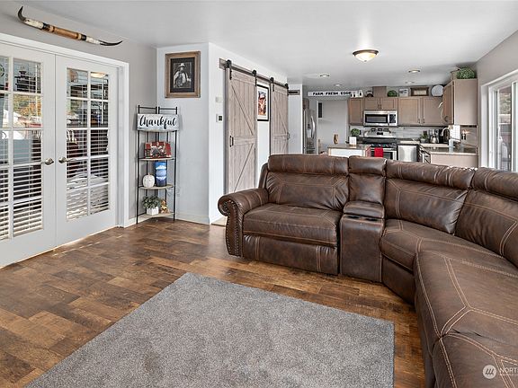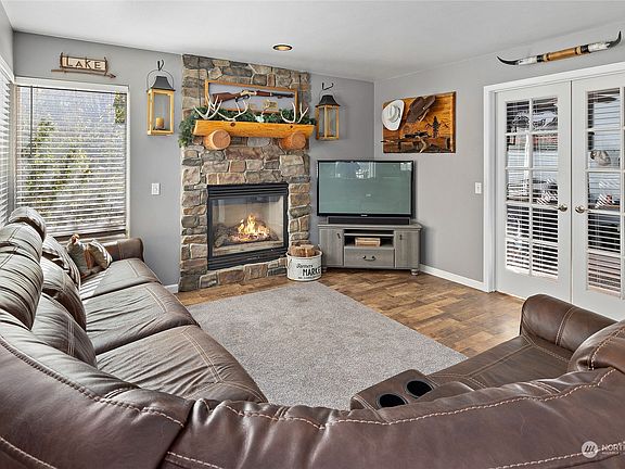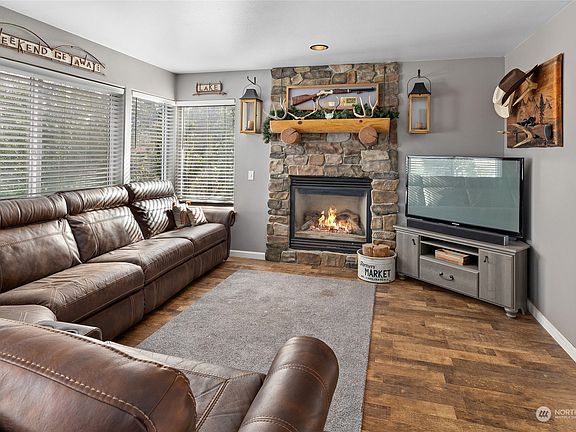 Need extra room? This spacious 3-bed, 2.5-bath gem also offers a den + bonus area! The interior of this charming home exudes a cozy cabin feel w/stone fireplace & barn wood accent walls. The greatroom floorplan seamlessly connects the living & and kitchen, w/ access to the back deck- making it perfect for entertaining. Whether you're cozied up by the fireplace or preparing a meal in the well-appointed kitchen, you'll feel the rustic charm at every turn. The loaded primary suite is a sanctuary of luxury w/amazing sunrises! Unwind in your fenced backyard oasis, complete w/relaxing hot tub. Attached 2 car garage, off street parking, & room for your RV. Nestled in a prime location on the edge of town, this home is your gateway to the good life.