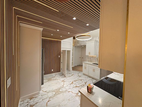The main apartment showcases wide-plank 7" white oak floors throughout, complemented by sleek acoustic wood panels and elegant 3" recessed spotlights for a warm and inviting ambiance. The chef's kitchen boasts a striking marble backsplash, brand-new stainless steel appliances, and ample cabinetry for all your culinary needs.