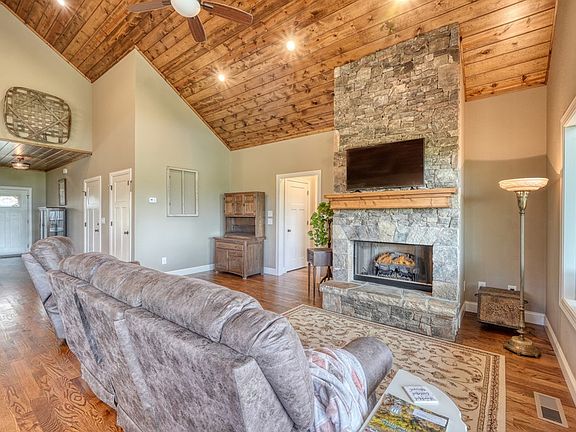 Rocking chair front porchStainless steel appliancesLarge pantryGranite countertopsSoft-close custom cabinetryFloor-to-ceiling rock fireplaceTongue-and-groove wood ceiling