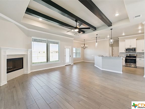 This Nixon plan is a 4BR/2BA with a study, 2-car garage, and 2279 sqft. Enjoy the warmth and coziness of a wood-burning fireplace and wood-beamed ceilings in the living room. Additional features include spray foam insulation, crown molding, wood-look ceramic tile flooring in main areas, ceiling fans, granite countertops, custom soft-close cabinets and drawers, study with French doors, automatic sprinkler system and fully sodded yard with landscaping.