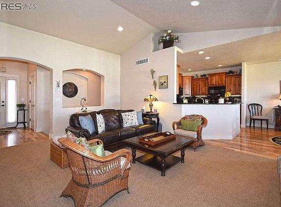 Stunning home on cul-de-sac w/open floorplan & vaulted ceilings on .22 acre corner lot across from park, backs to greenbelt, mtn views, near Windsor Lake. Future elem school to be built across street. Great room, lg eat-in kit/din w/granite, alder cabs, instant hot-water faucet, 5pc master bath w/granite counter, soaker tub & walk-in, humidifier, hickory floors, frpl & unfin bsmt. Lg prof landscaped yard w/sprinklers, vinyl fencing & patio. $305/yr non-potable water fee through Metro District.