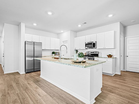 Versatile loftLarge islandStainless appliancesWhite shaker cabinetsOpen-concept layoutModern kitchenCovered back porch