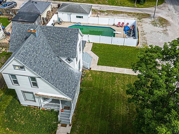 Captivating 4 bedroom, 2.5 bath two story aluminum sided home perched upon an established 80X150 corner lot just steps from the historic downtown district! Main floor of home features a generously sized living room with an electric fireplace, classic built-ins, open staircase, and two exterior access points, open equipped kitchen/dining concept with stainless appliances, laminate flooring, granite countertops, and a tile backsplash, convenient rear half bath, gracious primary suite with a private adjacent full bath, and a fascinating rear sunroom -- must to view! Upstairs, you will find three additional nice sized bedrooms and a full hall bath with convenient laundry facilities. Looking for a choice place to relax and/or entertain family and friends this summer? This showplace home features a gorgeous 16X32 inground pool complete with a diving board, large adjacent concrete patio, and vinyl privacy fencing. Property also features a partial basement, detached garage with ample adjacent additional off-street parking, newer concrete sidewalks, covered front and side porch areas, newer architectural roof, two furnaces/two central air conditioning units (one for each floor), various recent plumbing and electrical upgrades, newer soffits/fascia (2020), vinyl replacement windows, and all appliances to remain upon settlement for new owner(s). From the eye-catching exterior curb appeal to the inviting move-in ready interior, you (and yours) will want to call this one HOME!