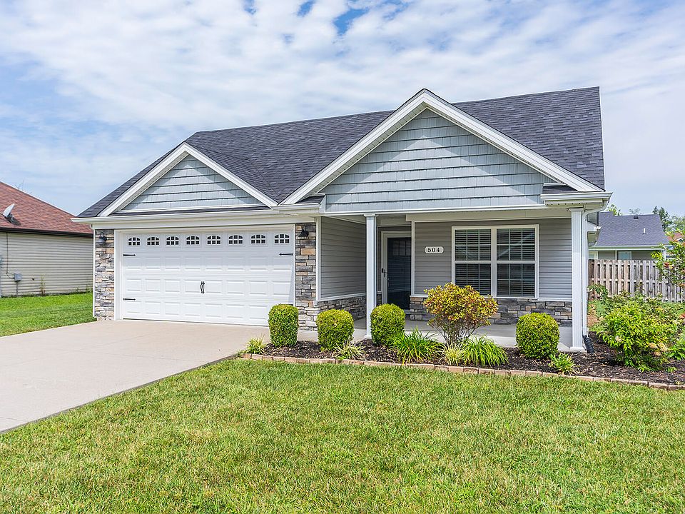 Notice the covered front porch accented with stone veneer, as you walk through the front door. Once inside, you'll find a foyer flow into a spacious living room. Head into to the kitchen to find an open and airy space perfect for cooking dinners and enjoying family time together, don't forget about the upgraded fridge.