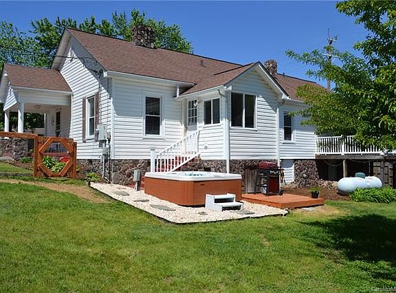 This adorable farmhouse-y cottage will capture your heart in a hurry. Stress slips away here, whether you are sitting on the shady front porch in front of a welcoming front yard with mature trees, or, if you prefer, relaxing in the back where a sandy playground and firepit are ready for friends. A quick change and a net turns it into a volleyball court! A bubbling hot tub and grilling deck complete the fenced back yard, with additional, unfenced pasture beyond making up the rest of the 1.17 acreage. Inside a cozy living room features a fireplace, a well-portioned kitchen with ample dining space and a laundry/mud room off the back. Four generous sized bedrooms with hardwoods (one bedroom is a walk-through), and two full baths finish out the space, with several storage closets and replacement windows throughout. The master has two closets and a sliding glass door that spills out onto an intimate, private deck overlooking the back yard and pastureland. Partial basement w/ a woodstove.