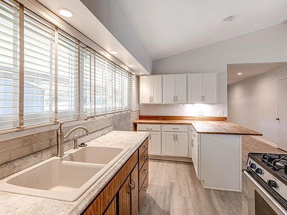 Home has LVP flooring throughout (except for bedrooms which have hardwood parquet floors). The attached garage is perfect for keeping your car out of the weather. A large driveway provides space for 2 more vehicles. The deck is partially shaded and measures 16' x 24'. Fenced in back yard. Pets are welcome!