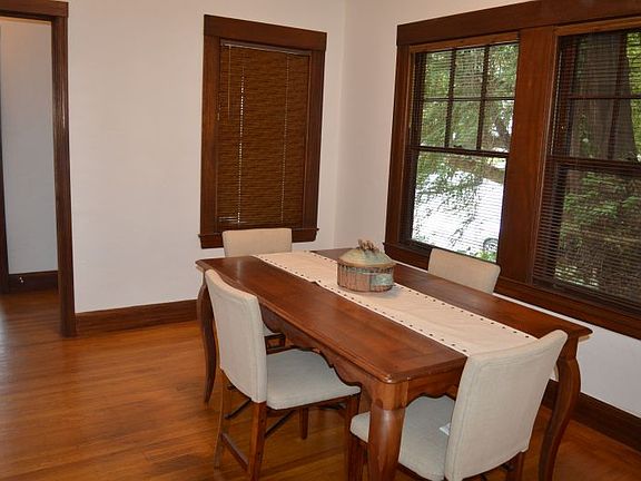The house has lots vintage charm, including beautiful oak hardwood floors throughout. A large living room with mullioned French doors, tray ceilings and decorative tile fireplace and separate formal dining room with wood crown molding and wood trim. Adorable farmhouse style kitchen with gas range. Two bedrooms and a bonus office/bedroom downstairs. Washer and Dryer included. Featuring a 1-car garage, providing secure parking and additional storage space. Step outside to the garden patio/yard, a perfect spot for outdoor relaxation and deer watching.