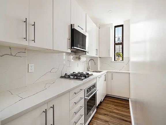 The fully renovated windowed kitchen with panel fridge has tons of storage, microwave with exhaust fan, in-wall oven, full stovetop, quartz countertops and a panel-front Bosch dishwasher. The spacious bedroom has a large closet and plenty of room for a king size bed and additional furniture. The new windowed bathroom has a standing shower and double sinks.
