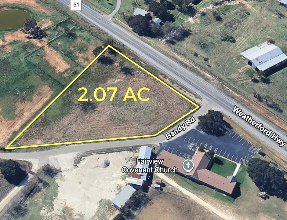 Excellent location with 330.5 feet frontage road on HWY 51 as well as access on Bandy Road. Level parcel with ingress and egress entrance. Great building site for residential, a multi family development, or a commercial venture. Minutes from historic Granbury Square, and outside the city limits. 15 minutes to Weatherford and 45 minutes to Ft Worth. A water tap is available through Aqua Texas. Deed restriction is no mobile homes. Buyer to verify all facts.